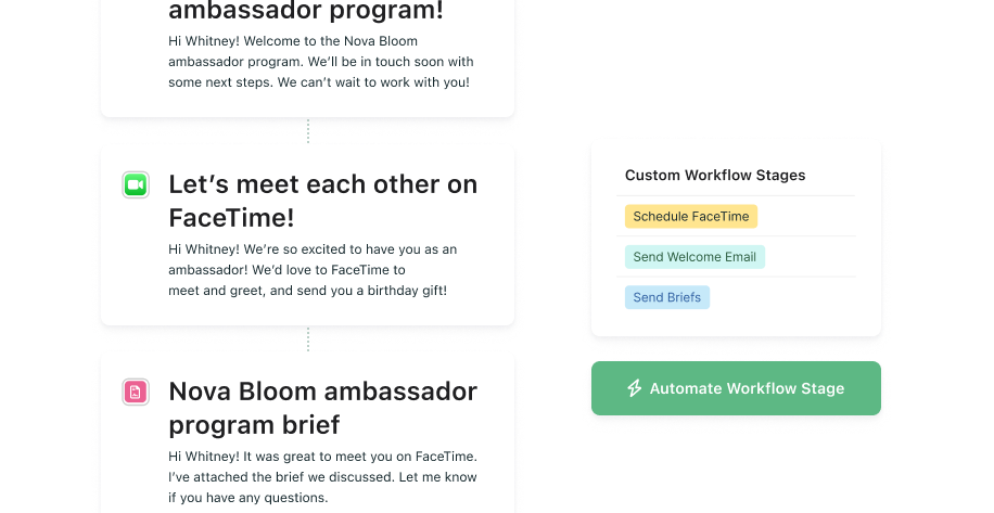 Get to know your ambassadors before the collaboration begins. Add a step to virtually meet & greet your new ambassadors, automate follow-ups, and seamlessly send and sign contracts.