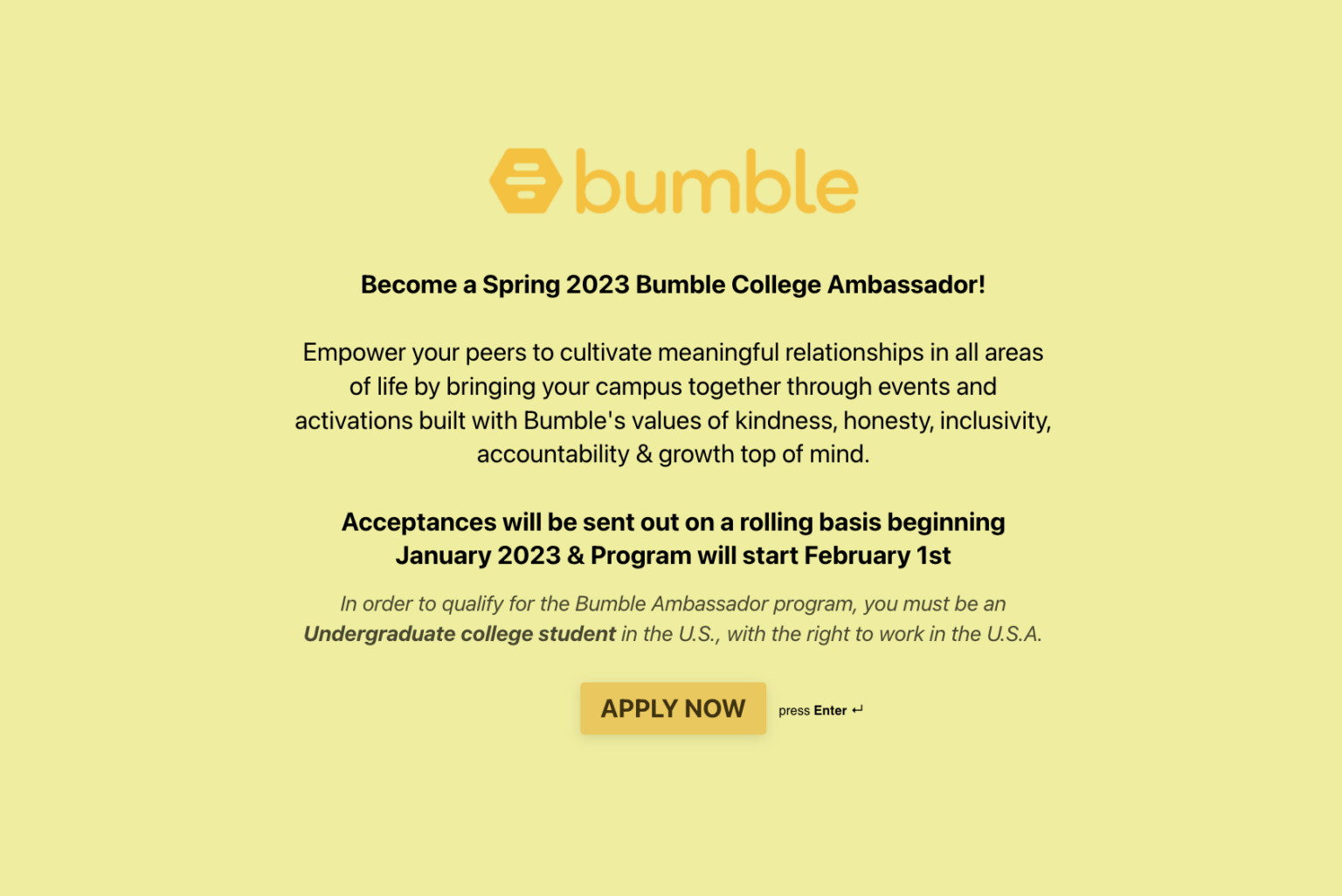 Bumble recruits “Honey Ambassadors” from colleges to promote the dating app. Users can apply to become ambassadors and are encouraged to spread the word about their swiping experiences through campus events, activities, and social posts.