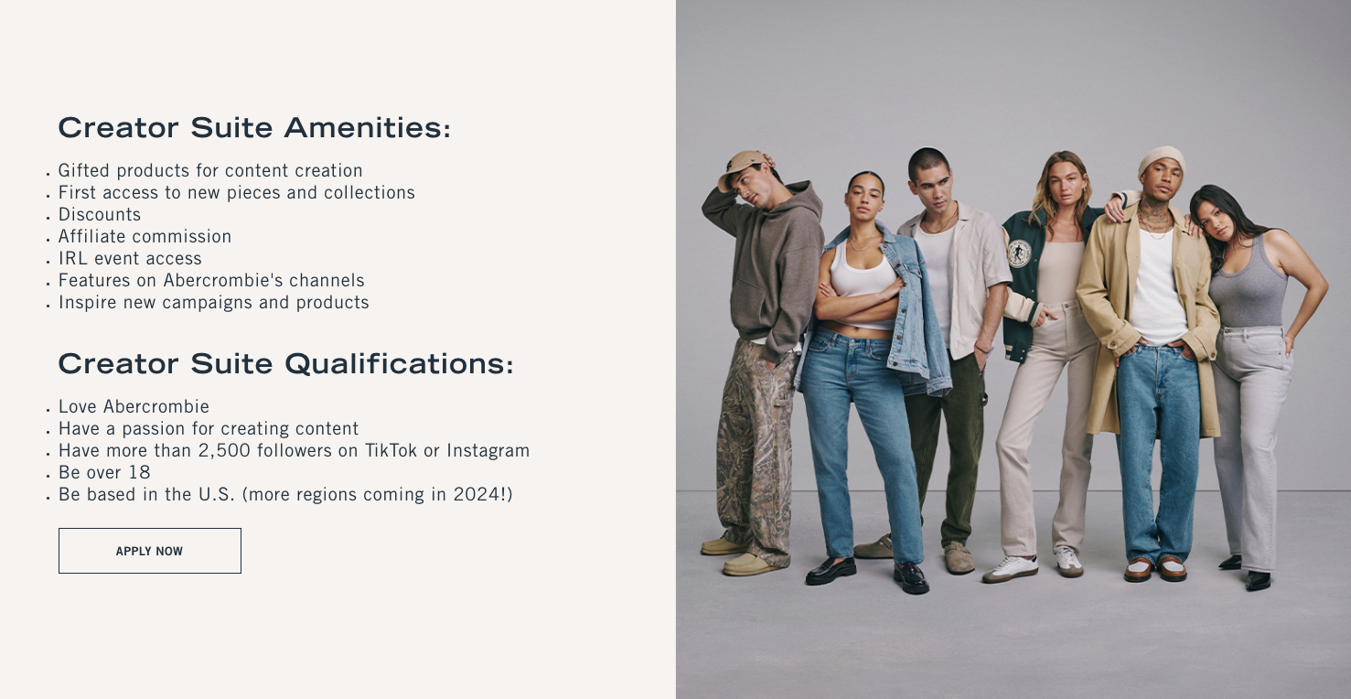 - Community building initiatives: Just 3 months ago, the retailer launched The Abercrombie Creator Suite, where creators can complete challenges and unlock exclusive perks, gifted products, and campaign opportunities, all while earning commission. Through this community program, Abercrombie can reward its biggest fans and deepen its creator relationships, ultimately boosting brand loyalty.