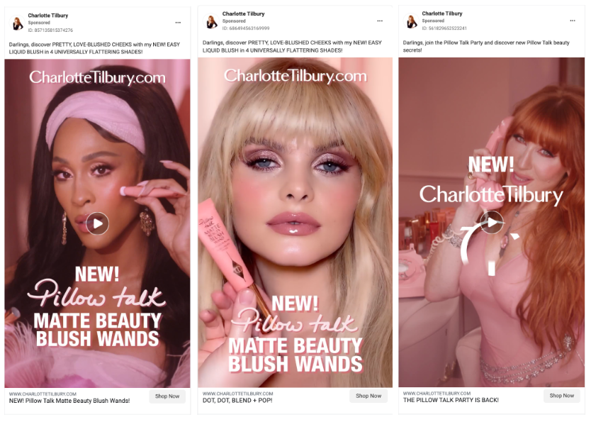 - Traditional influencer program: With a focus on video content, Charlotte Tilbury’s influencer partners produce makeup tutorials and get-ready-with-me style videos for Instagram, Facebook, and TikTok. This type of content is high-performing and extremely effective, because audiences can watch as creators apply the makeup and see which product sets to purchase to achieve each look. The brand then takes these influencer-generated videos and repurposes them as paid ads across various social channels.