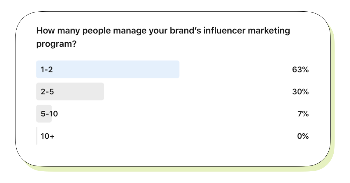 Our recent LinkedIn poll revealed that most influencer marketing teams are very small, with 63% of respondents saying their influencer marketing program is managed by just 1 or 2 people.