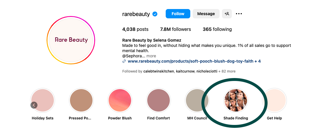 Many e-commerce brands are taking this a step further by providing self-service options through social media, offering FAQs, troubleshooting guides, and product tutorials. This proactive approach not only reduces support volume but also meets the expectations of 88% of consumers who prefer self-service support options available 24/7. For example, check out how Rare Beauty uses their Instagram Highlights to help their customers find their perfect shade.