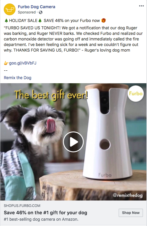 Whether you pull it from reviews or direct interactions with customers, their authentic love for your products will give your brand more credibility and provide social proof. Additionally, by featuring a direct quote from a customer in an ad, you’re allowing them to be part of the brand building process. Below, Furbo Dog Camera highlighted one customer’s amazing story about how its product saved their home.
