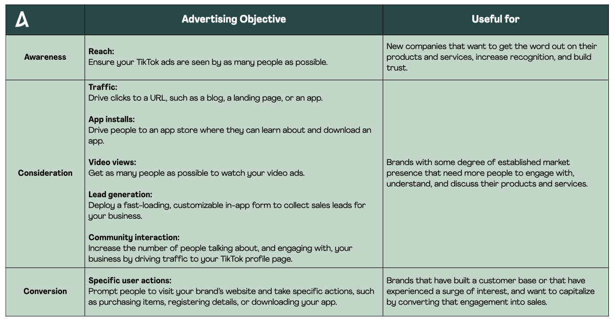 First thing’s first: when you set up your campaign, you’ll be guided to choose your advertising objectives. The TikTok Ads manager organizes 7 objectives into 3 categories: awareness, consideration, and conversion – each of which describe different business goals.