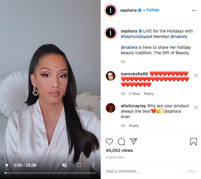 Launched in 2019, #SephoraSquad is the beauty company’s team of ambassadors, who have a diverse range of followers, perspectives, and interests. As Sephora expands its ambassador program, it cycles through an intensive recruitment process, in which they analyze tens of thousands of applications — which include testimonials from applicants’ existing social communities. The goal is to find beauty creators who could represent diversity in various categories, like hair texture or skin type in older age demographics.