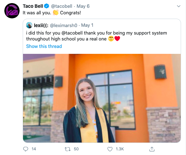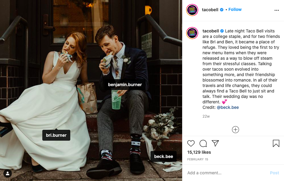 Taco Bell constantly shares community-generated content via its Instagram and Twitter. In both examples below, Taco Bell shares its community’s emotional stories tied to the brand, showcasing that Taco Bell is more than just another fast food chain to many consumers — it’s part of the big moments in their lives.