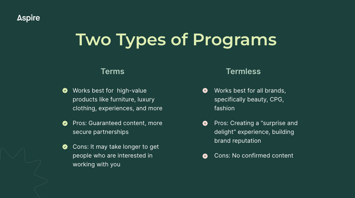 A typical seeding campaign is termless, meaning you send your products to influencers with no expectations that they’ll post or create any content around your brand. This is a great way to create a surprise-and-delight experience for creators and build your brand affinity.