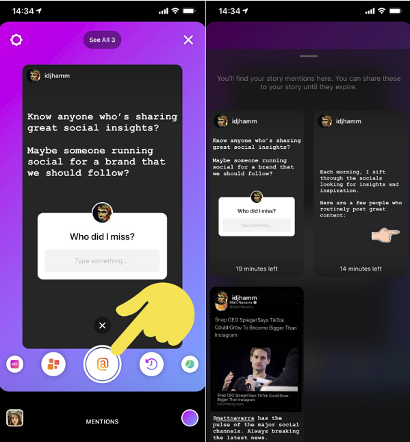 Luckily, Instagram makes this process easy. The app will notify you if someone has tagged you in their content, either through Direct Messages (when someone mentions you in their Story) or activity notifications (when someone tags or mentions you in their feed content). In addition, Instagram recently launched a new Stories @ mention tool, which collects any Stories that mention your profile and enables you to share them on your own highlights.