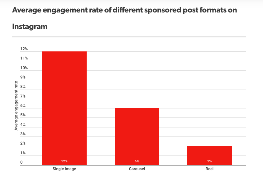 This change is represented in the numbers. A recent study revealed that still images and carousel posts receive higher engagement than Reels, specifically when it comes to sponsored posts.