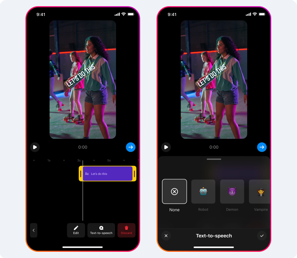 - New audio features allow you to add clips with audio to Reels via Meta’s GIF “Clip Hub.” This will enable you to add popular memes into your own photos and videos, providing more ways for creators to produce more relevant and engaging content. Additionally, 10 new English text-to-speech voices will also be available in select countries.