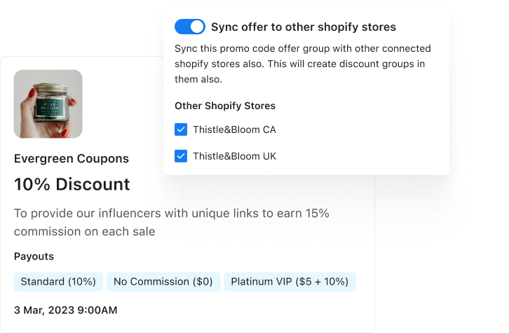 - Multiple Shopify Store Support: Generate cascading offers through one Shopify store and choose to activate offers on their other connected Shopify stores.