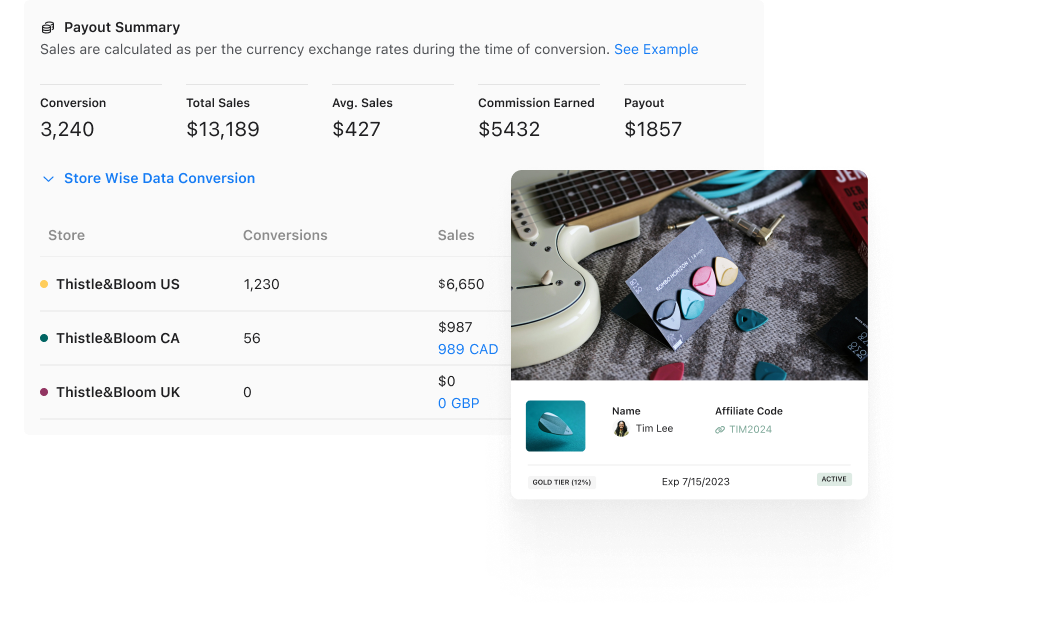 - Member level reporting: Click “View Stats” to see a summary of the conversions a member has driven. Because promo codes from each store are connected to the same offer, brands can see how many conversions a creator has driven for each store. Ultimately, this allows brands to quickly identify and reinvest in their top-performing creators who drive the most conversions or the biggest orders.