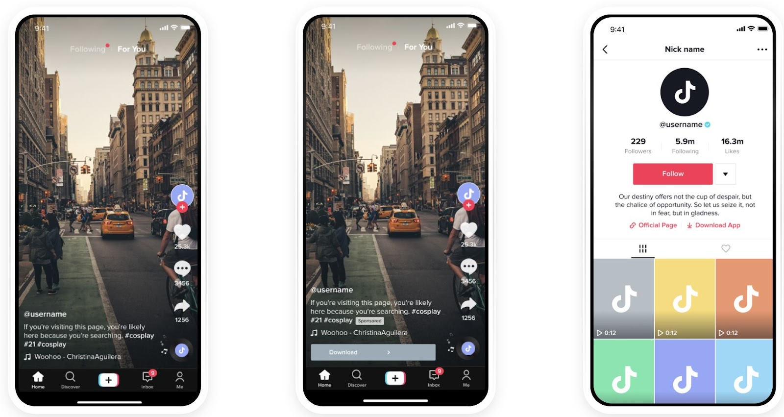 Video ads appear in both the For You feed, and the News Feed, and can be uploaded in .mp4, .mov, .mpeg, or .avi format. While business users can upload video ads of up to 60 seconds long, TikTok recommends durations of 9 to 15 seconds for optimal engagement. Video ads have all the features of standard user content, including audio clips, effects, and transitions.