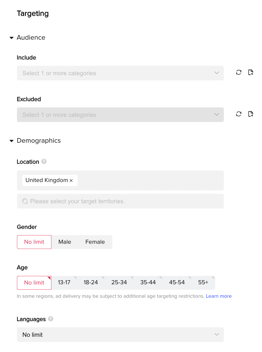 Next up, it’s time to select your target audience. Within the TikTok Ads Manager, business users can customize their Ad Group’s target audience by including and excluding certain demographics. They also have the option to create a ‘lookalike audience’, which gives TikTok permission to share their ads with users in similar demographics to those in their chosen audience.