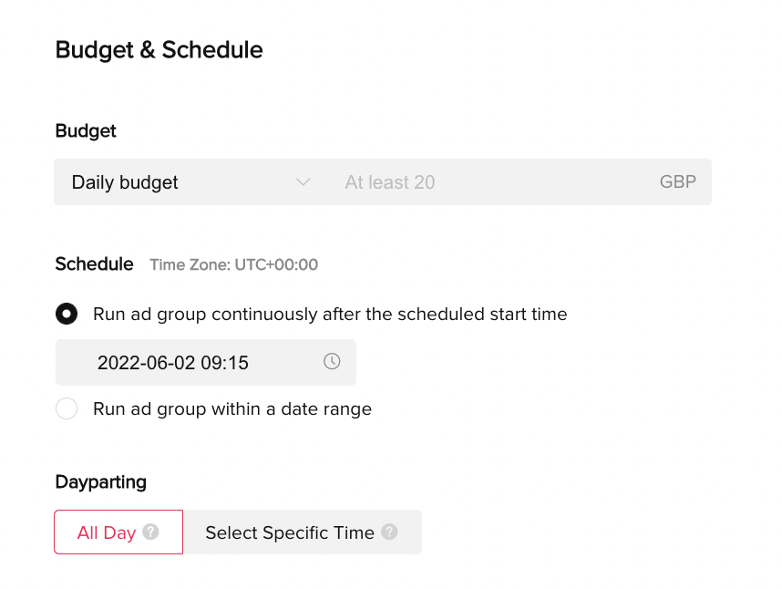TikTok Ads Manager allows you to assign a daily or lifetime budget to your ads, set start and end dates, or set them to run continuously. You can also use the ‘Dayparting’ function to select a specific time of day for your ad to run.