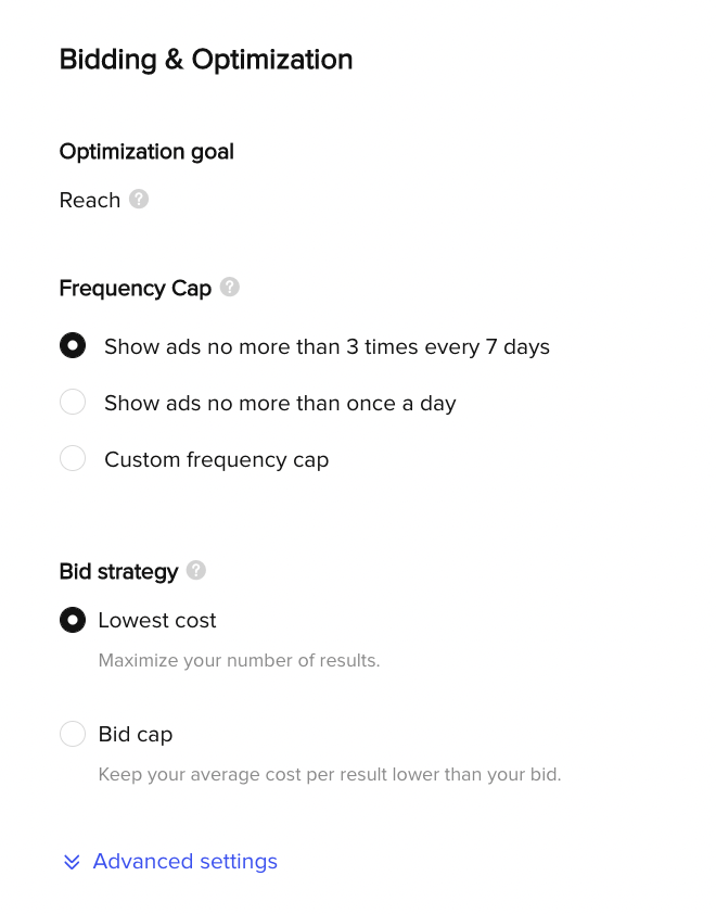 - Bidding strategy: Choosing a cap will ensure you never spend more than your bid amount. However, if your cap is set too low you may end up not spending your daily or lifetime ad budget.