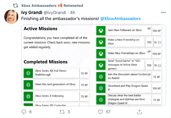 Ambassadors have seasonal, monthly, and daily challenges that unlock special rewards like Xbox Live badges, exclusive swag, sweepstakes tickets, and editorial spotlights. At the same time, they also contribute to making Xbox a welcoming online community by starting forums on Discord and Twitter to discuss gaming strategies or by adding friends on Xbox, for example.