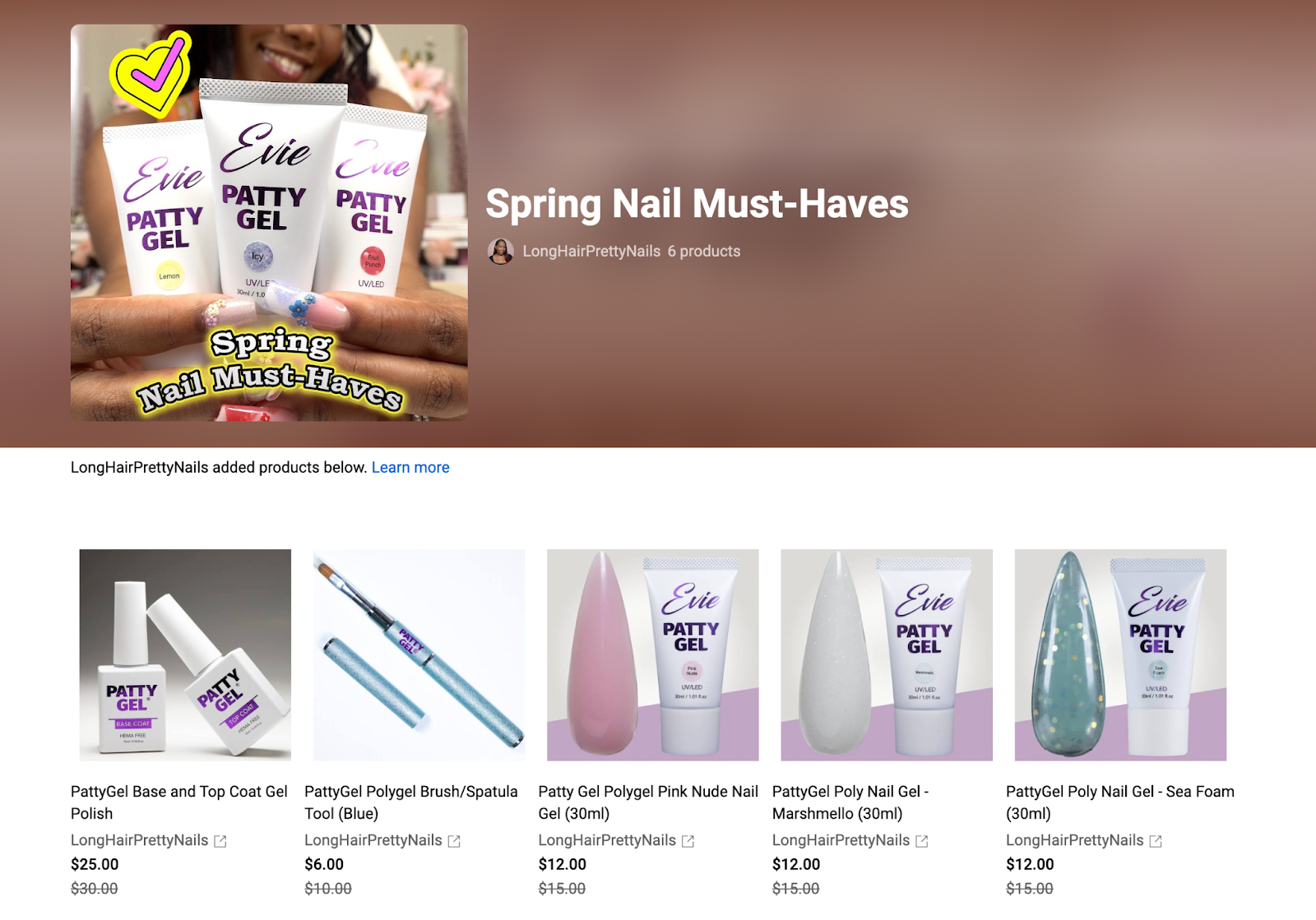 These collections make it easy for viewers to shop directly from the content they love. Take a look at LongHairPrettyNails collection, “Spring Nail Must Haves,” for example.